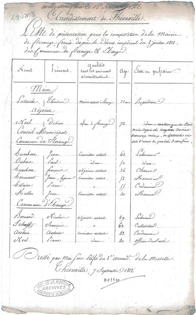 Liste de présentation pour la composition de la mairie de Florange fournie d’après le décret impérial du 4 juillet 1812 des communes de Florange et d’Ebange