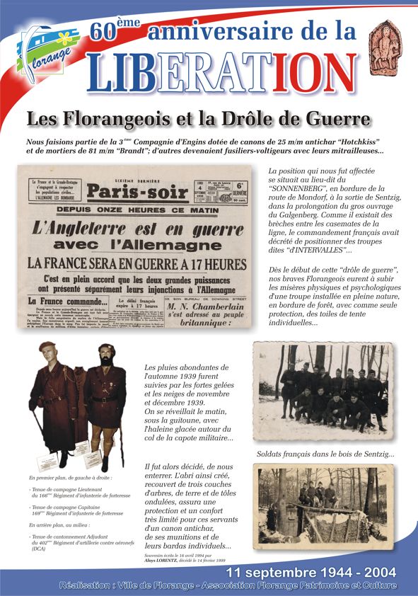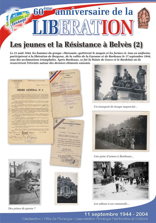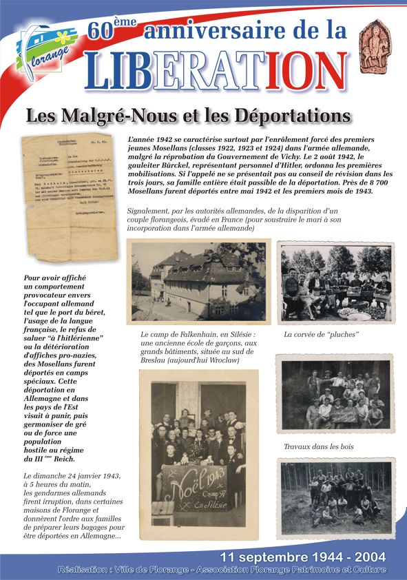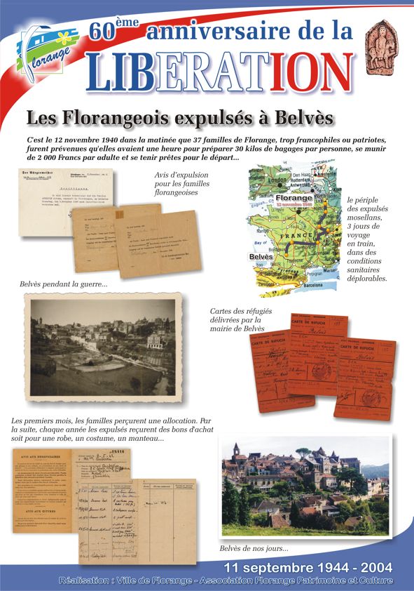 A l’occasion du 60ème anniversaire de la Libération, l’association Florange Patrimoine et Culture a organisé, en partenariat avec la ville, une exposition sur la vie des Florangeois durant la seconde guerre mondiale et en particuliers sur les habitants expulsés à Belvès.