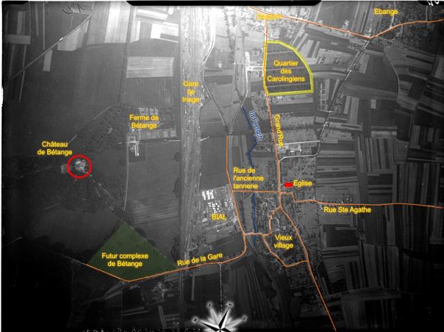 Mais que représente cette image ? Une œuvre d’art abstraite ? Bien sûr, vous avez tous reconnu une photo aérienne de... Florange [1]. Elle date de 1928, plus précisément du 28 mai 1928. Arrivez-vous à vous repérer ? Pour vous aider, on y voit la gare de triage, dans l’axe vertical au centre de l’image... qui n’existe plus de nos jours. En revanche, le complexe de Bétange est absent, quant à l’avenue de Lorraine personne n’en parle à cette époque ! Elle verra le jour en 1958.